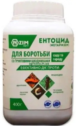 Перебуваючи в ґрунті грибок в активному стані очікує контакту зі шкідником, потрапляючи на якого, вражає його жирові тканини, кишечник, органи дихання та нервову систему.Суперечки гриба починають проростати через 12 годин. Загибель настає через 40-120 годин залежно від віку личинки, при цьому грибок використовує личинку для подальшого розвитку. При регулярному застосуванні засобу від ґрунтових шкідників Ентоцид (Метаризин), чисельність капустянки, колорадського жука, дротяника та інших личинок шкідливих комах суттєво скорочується. До речі, вони можуть бути причиною захворювання чи загибелі плодово-ягідних культур, т.к. вражають кореневу систему рослин, особливо тих, що приносять солодкі плоди. Препарат може застосовуватися для замочування насіння, обробки коренів розсади, і для нанесення в грунт. На ділянках, які населені шкідливими комахами, обробку бажано проводити навесні або восени перед скопуванням. Ефект досягається при внесенні препарату у вологий ґрунт. Для розрахунку необхідної кількості препарату пропонуємо скористатися розрахунковою таблицею